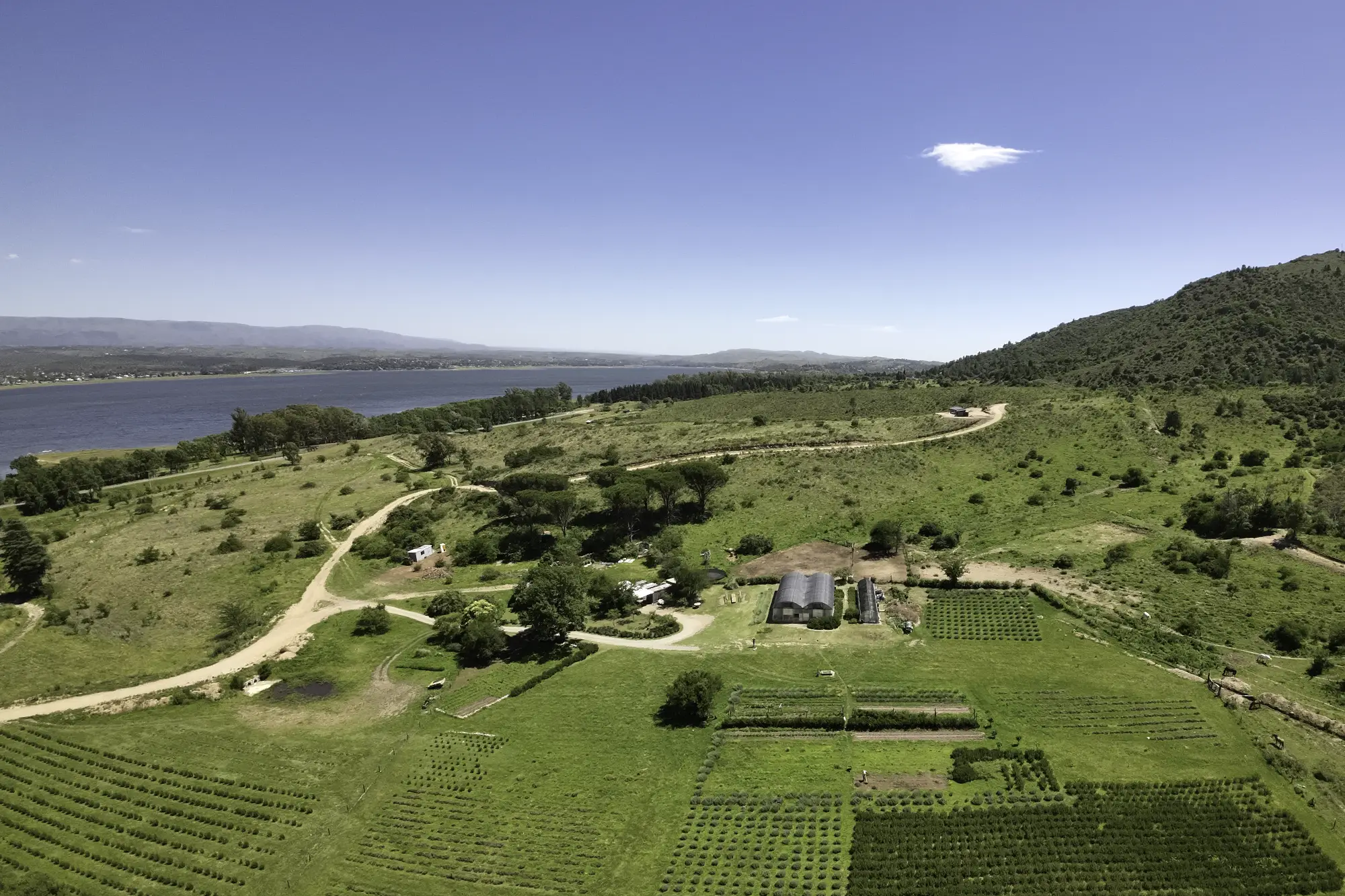 Lotes con vistas panorámicas a las sierras y al lago Los Molinos, rodeados de áreas productivas y viñedos.